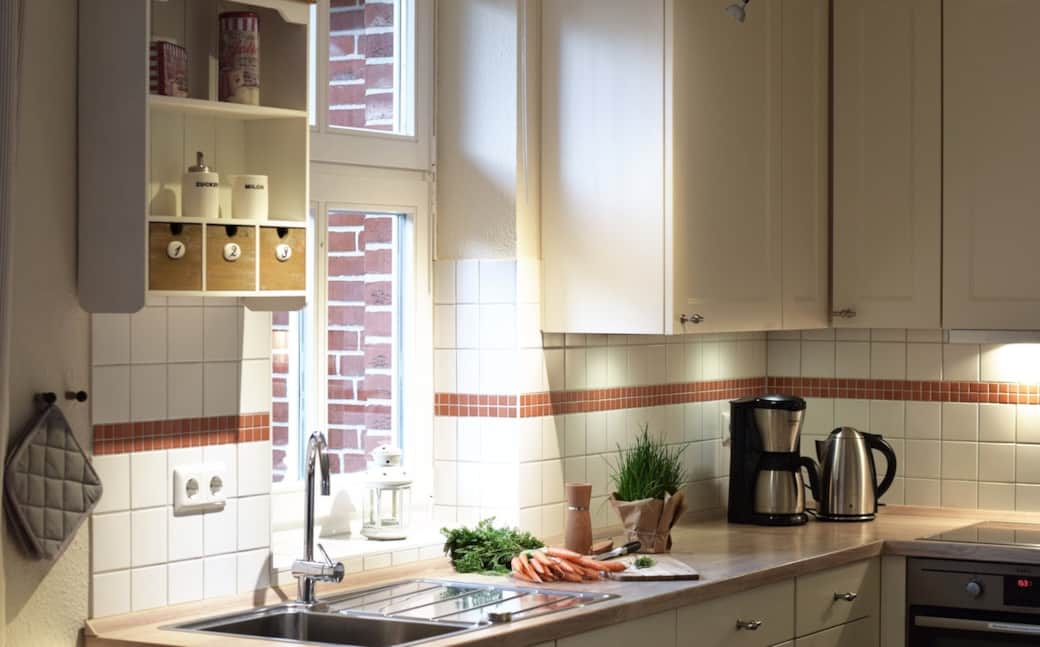 Holzkohlegrill, Küche, Kinderhochstuhl, Kaffeemaschine, Küchenausstattung, Geschirrspüler, Küchenherd, Mikrowelle, Backofen, Kühlschrank, Toaster, Staubsauger, Backblech, Esstisch, Geschirr und Besteck, Gefrierschrank, Wasserkocher, Weingläser